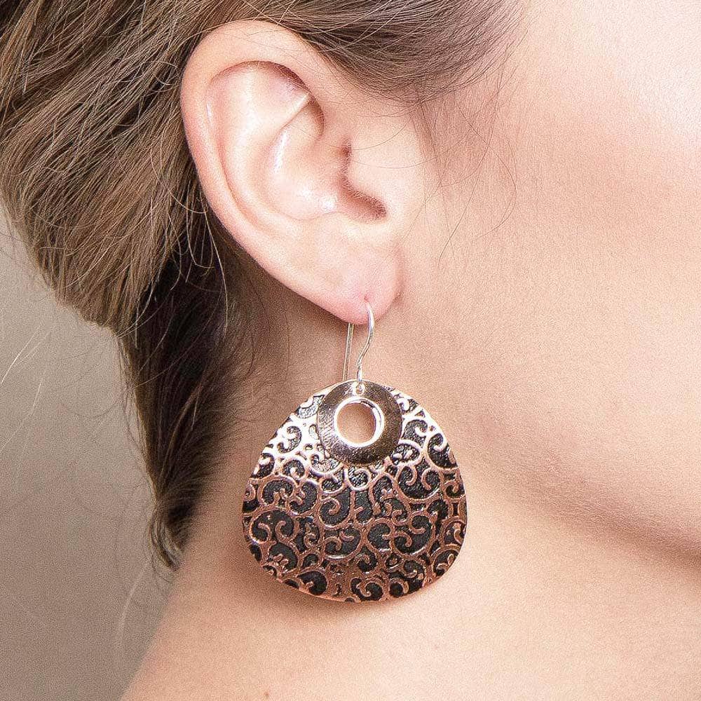 Waves of burnished bright and black copper surge together in these chic Black Copper Earrings. As intricate as vines climbing. these copper earrings call on one of the most ancient healing elements to bring love. cleansing. and life-giving properties to all who wear them. Bold and beautiful. these Black Copper pieces make a stunning statement. Not only do they look good but they invite you to rise in your spiritual power.